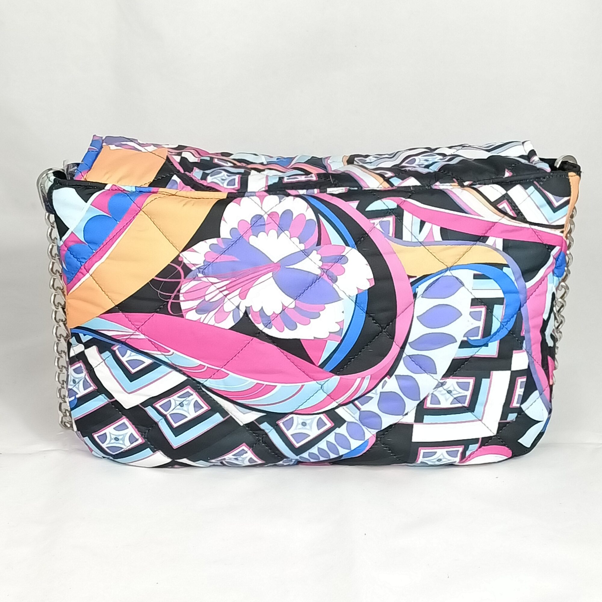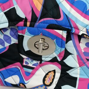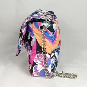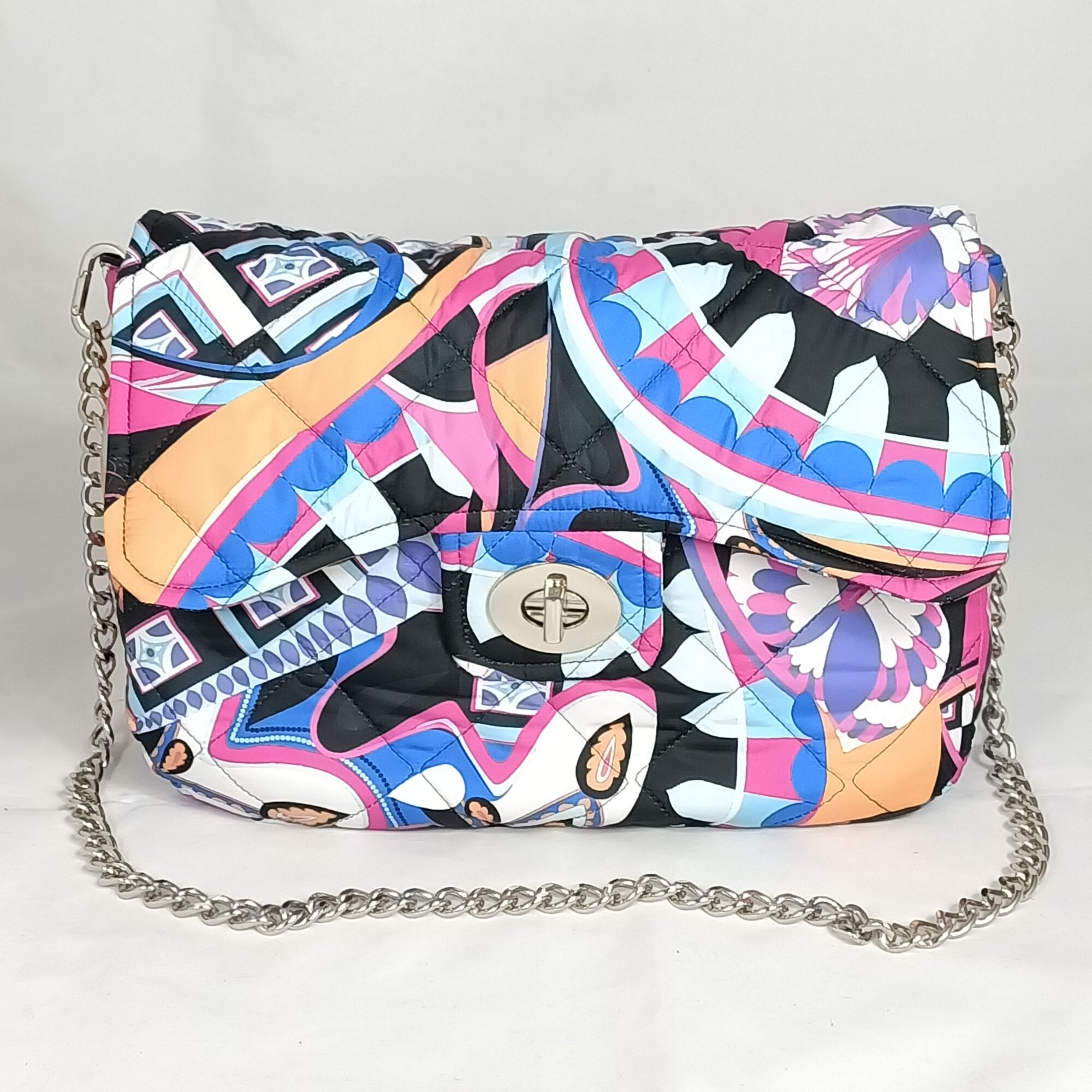 Borsa realizzata a mano ,con tessuto termico con disegno geometrico ,dai colori viola /nero/arancio, interno nero con tasca grande a zip, bella chiusura a girello color argento , tracolla catena color argento . Su richiesta tracolla può essere sostituita con altra tipologia.