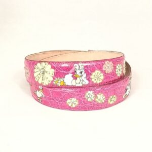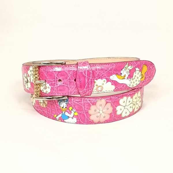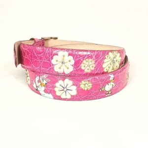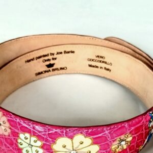Collezione cinture hand painted (by Jo Barile) , cintura in pelle di coccodrillo color fucsia con soggetto dipinto a mano , ulteriormente abbellita da fiori e cristalli .
