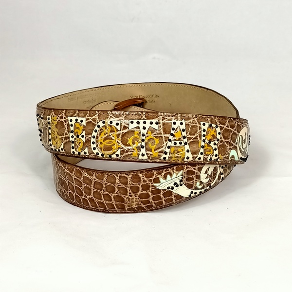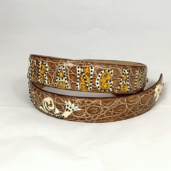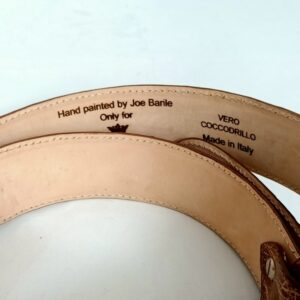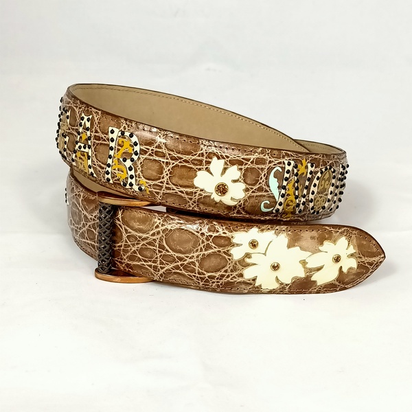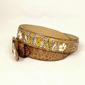 Dalla collezione cinture hand painted variante detti latini, cintura in pelle di coccodrillo color beige scuro dipinta a mano raffigurante la frase Latina “Frangar non Flectar” , arricchita da cristalli e borchiette.