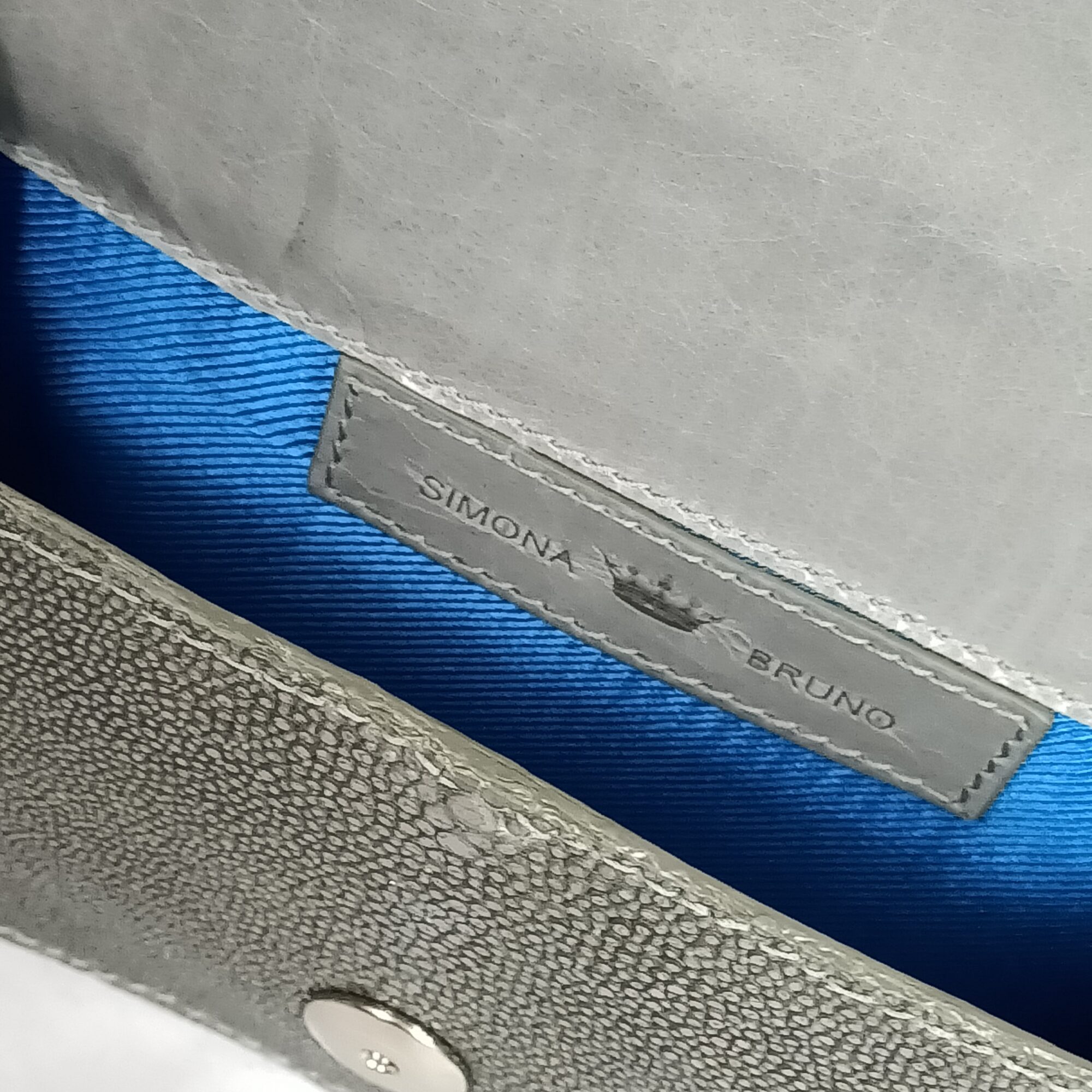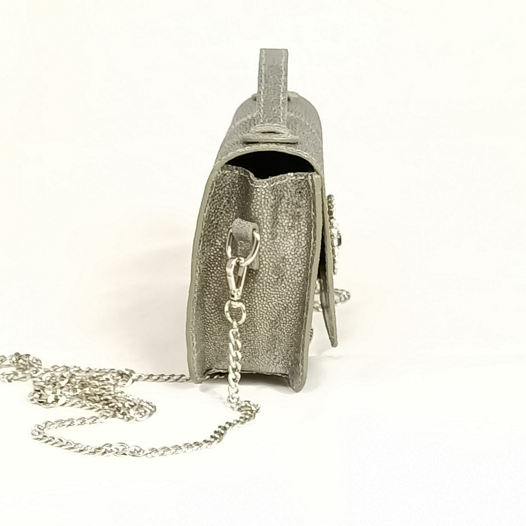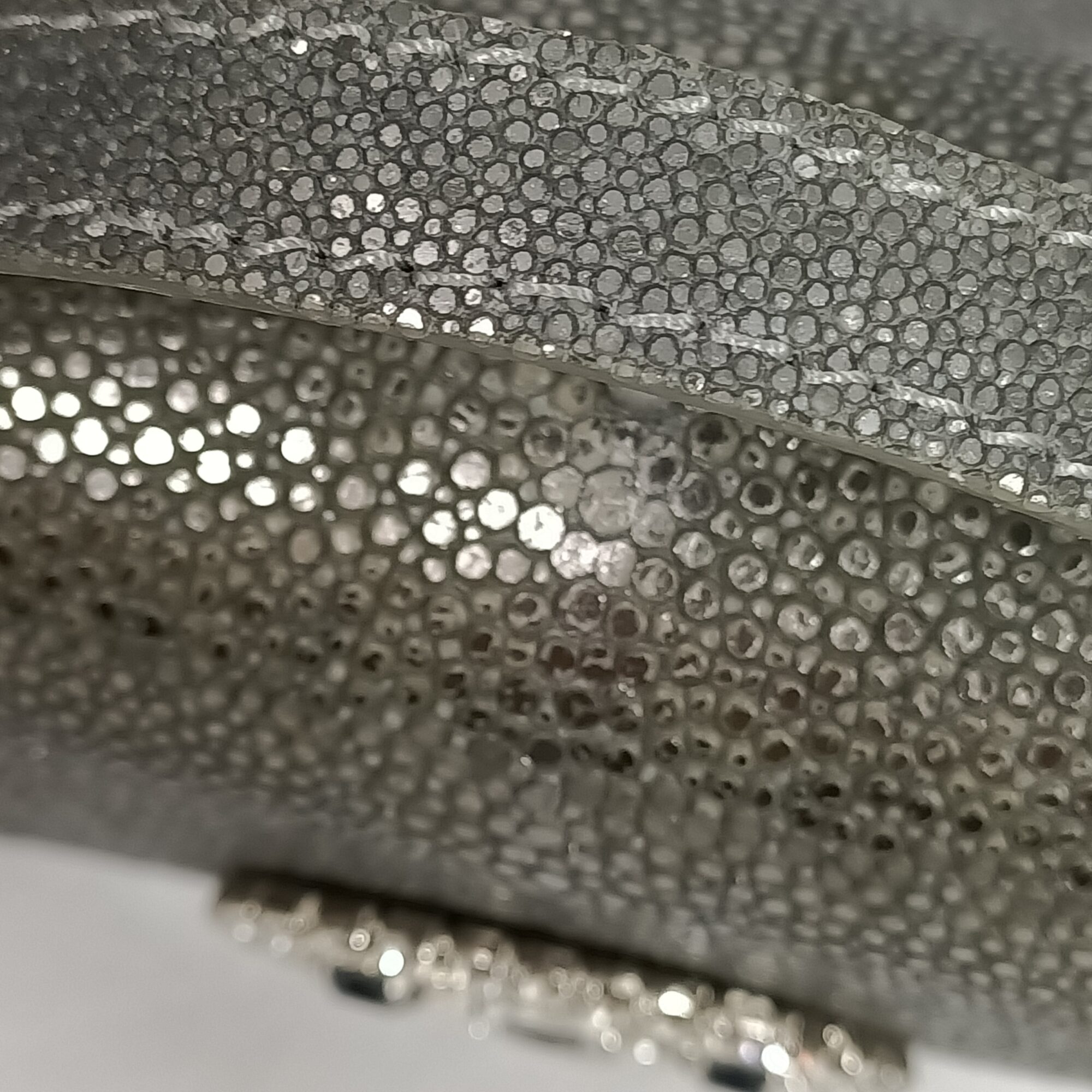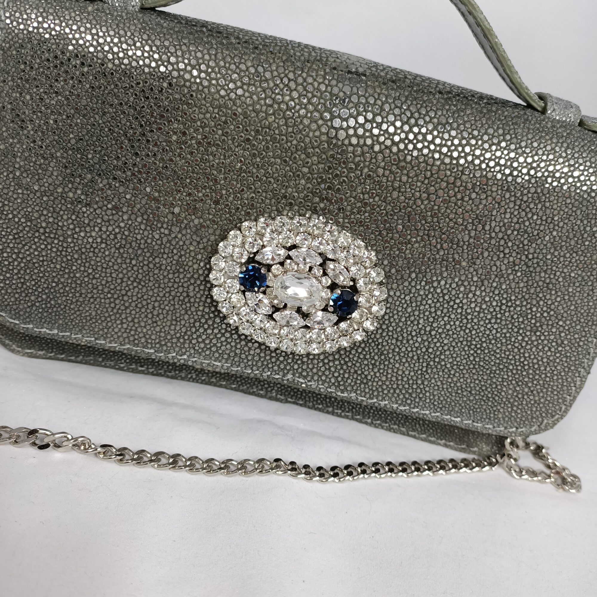 Elegante borsa da sera in pelle pregiata del pesce razza color argento , con chiusura gioiello cristalli bianchi e zaffiri . Foderata in seta pura blu zaffiro , è dotata sia di manico che di una tracolla a catena . Su richiesta questo modello può essere realizzato in altri colori e altri pellami.