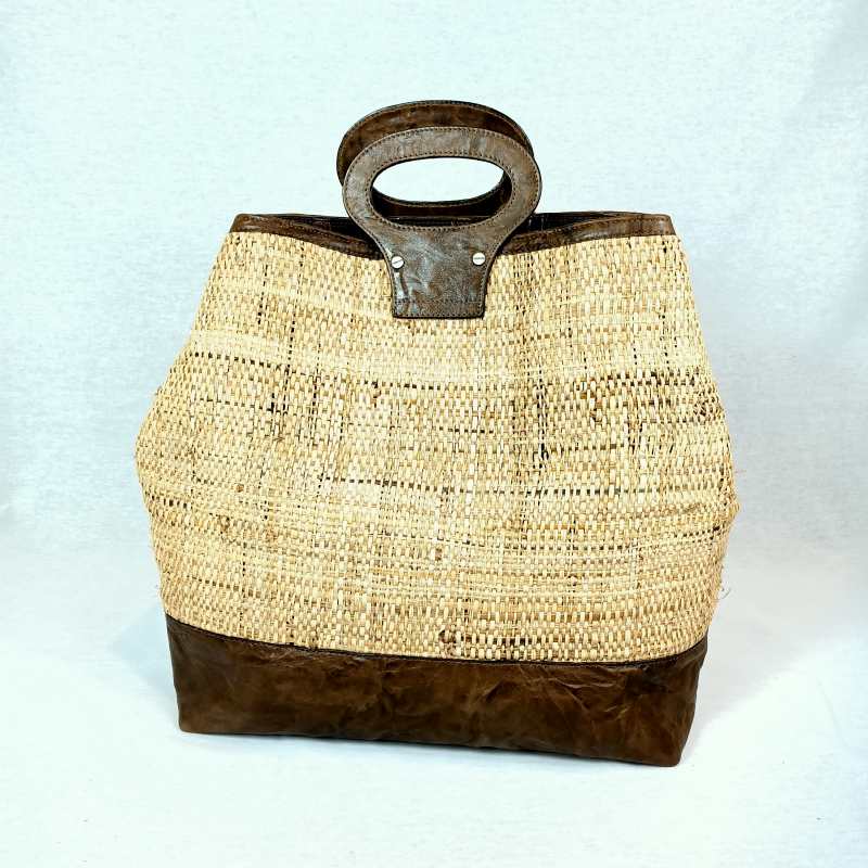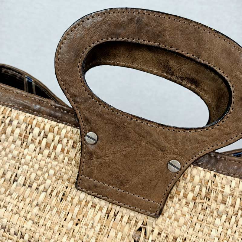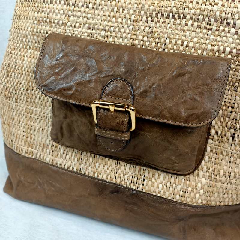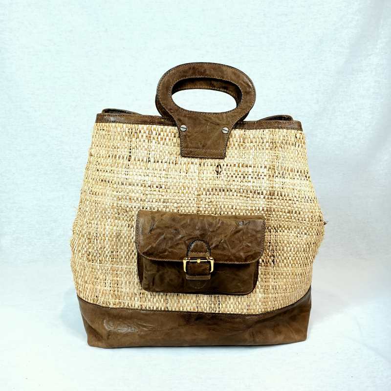 Borsa realizzata in paglia con inserti di pelle di capretto , un borsotto sulla parte anteriore , manici rigidi , interno interamente foderato in tessuto di seta con un taschino a zip . Prodotta nel nostro laboratorio è un pezzo unico , può essere realizzato anche in rafia .