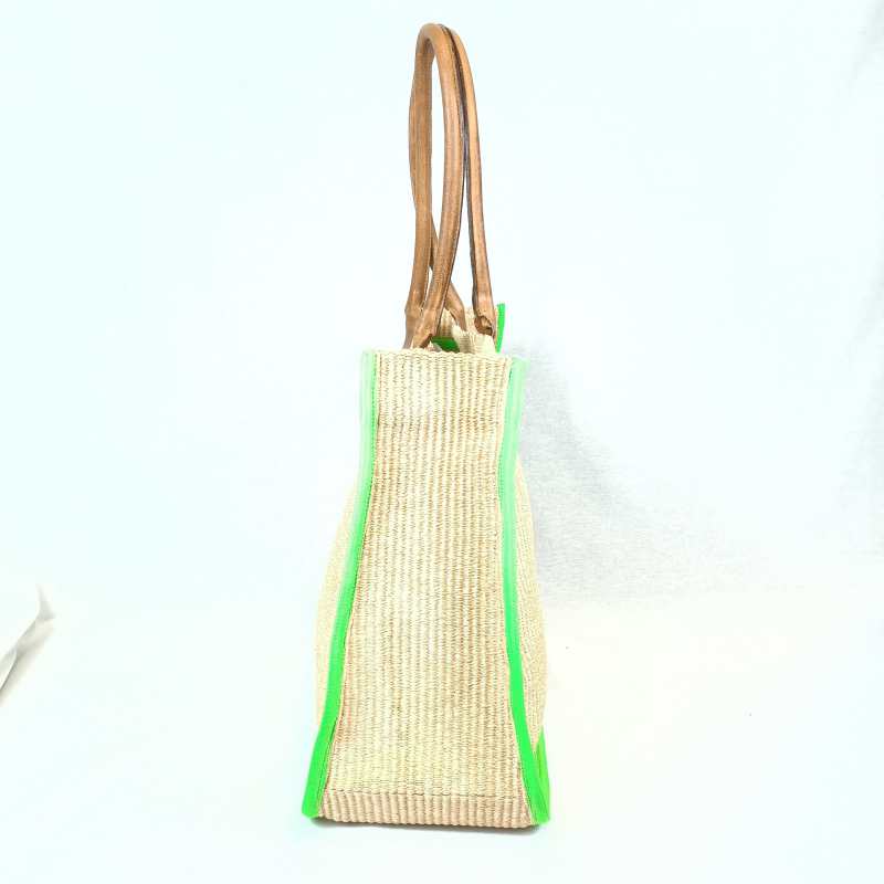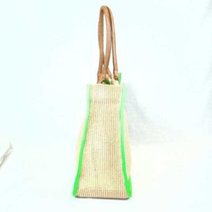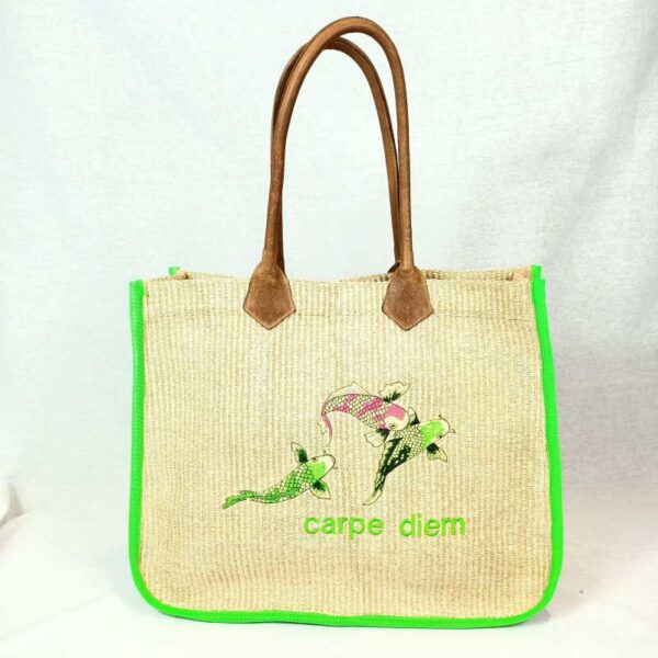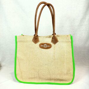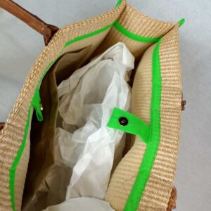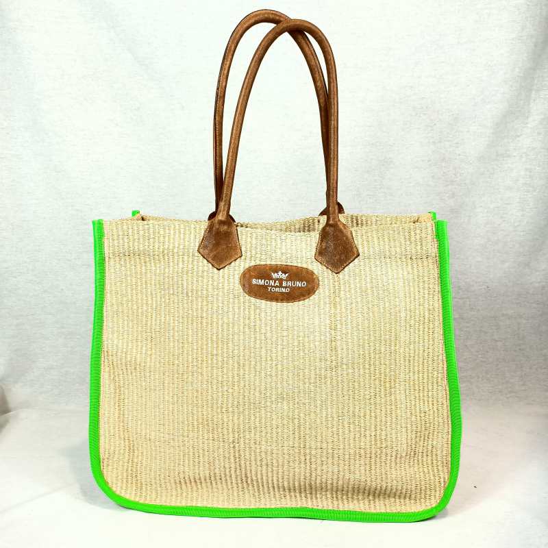 Borsa per il mare in rafia , manici di pelle, tasca interna e chiusura a calamita , profilo in tinta con la scritta. Messaggio ricamato.