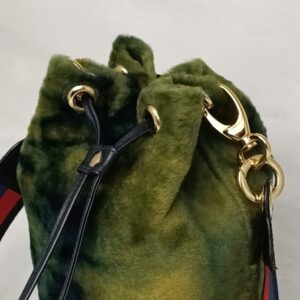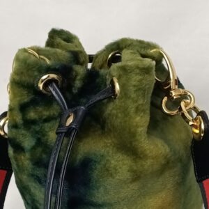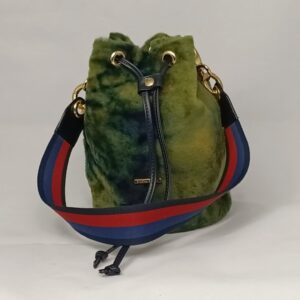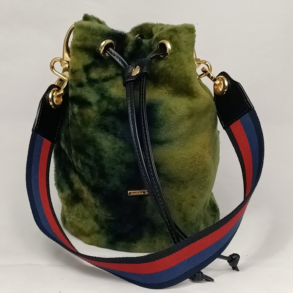Secchiello mini size di pelle di cavallino tamponato tonalità del blu e verde , con tracolla a spalla di tessuto , interno foderato con taschino a zip .