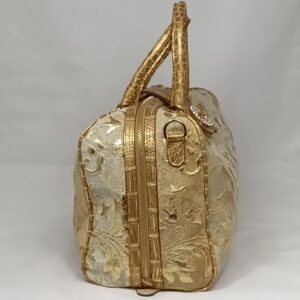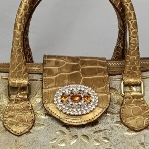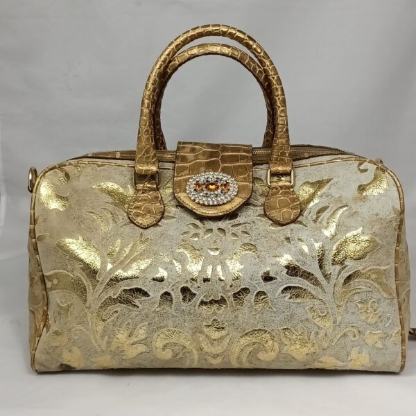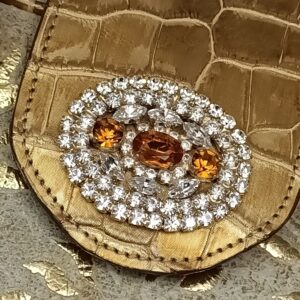 Pelle con motivi barocchi a rilievo in oro con dettagli di pelle di coccodrillo color oro , chiusura a doppia zip e fascia centrale con calamita ed accessorio gioiello (cristalli Swarovski Bianchi e topazio).