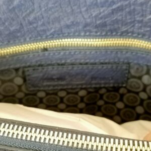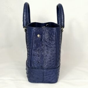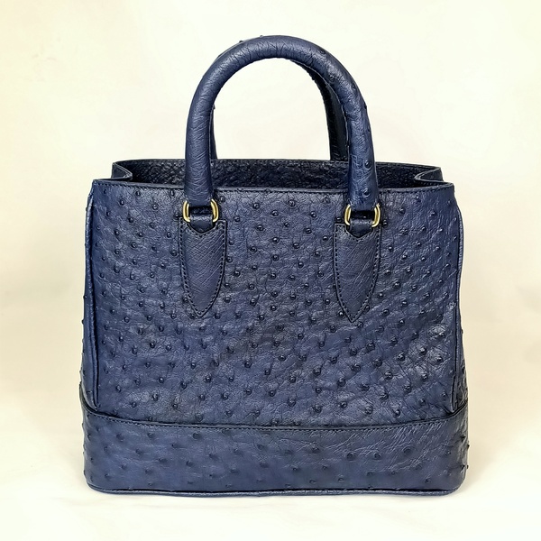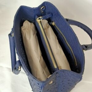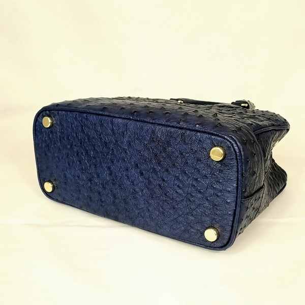 Borsa a mano interamente di pelle di struzzo blu, due manici e tracollina stessa pelle , due scomparti interni e zip centrale , chiodino sul fondo .