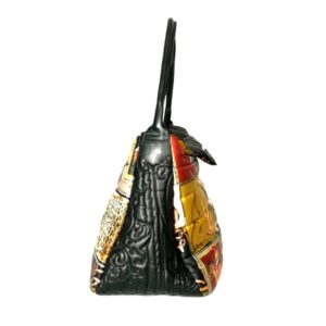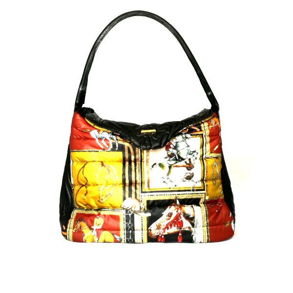 Tessuto fantasia disegno tipo Hermes e pelle ricamata nera , manico di pelle , dotata di due tasche interne.