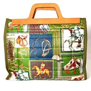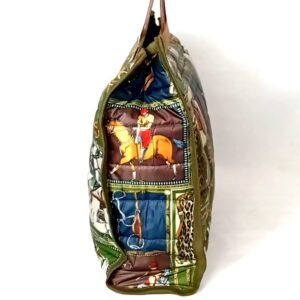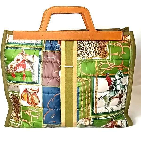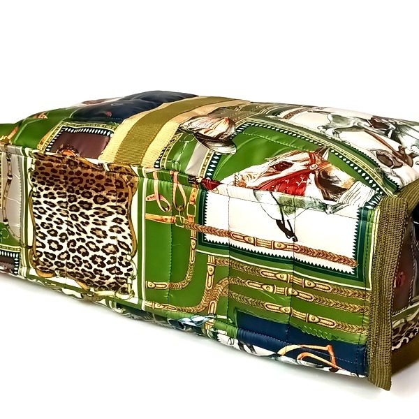 In tessuto tecnico dettagli di passamaneria e gros , manici in pelle , interno nero con grande tasca stesso colore esterno chiusura a zip .