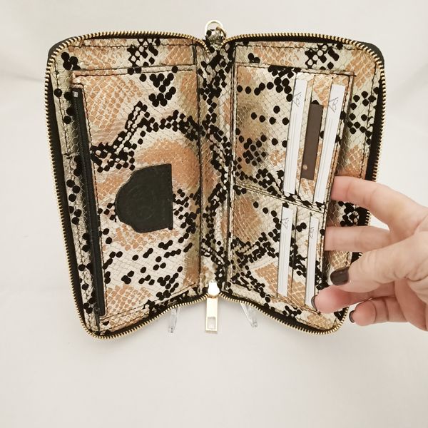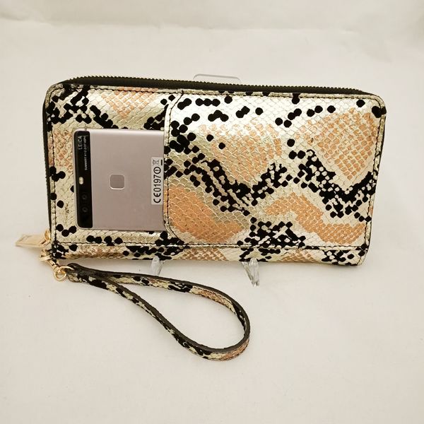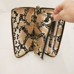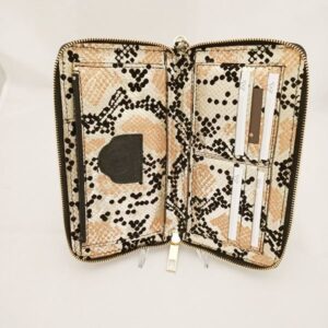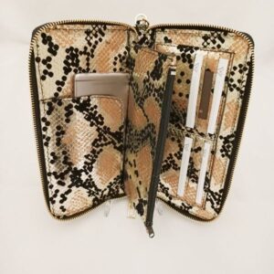 Nuovo modello di pochette realizzata in pelle con stampa pitone color oro /oro rosa/argento freddo con floccage nero ; tre funzionalità ovvero , portafogli , porta monete, porta cellulare ; manico a polso ,e chiusura a zip color oro . Su richiesta questo modello può essere realizzato in altra tipologia di pellame , anche pregiato.