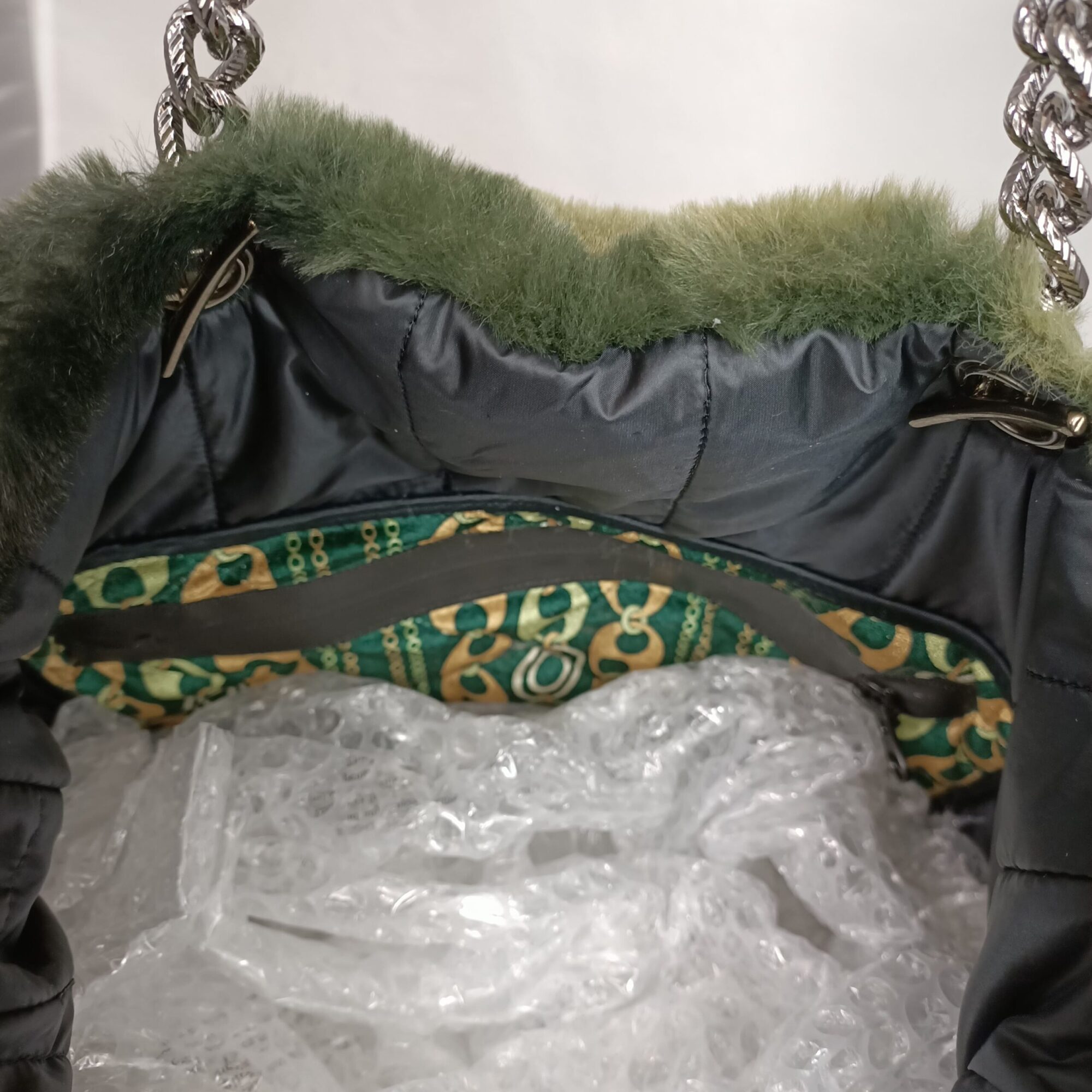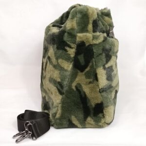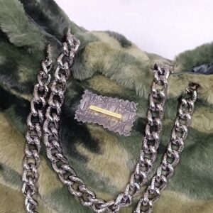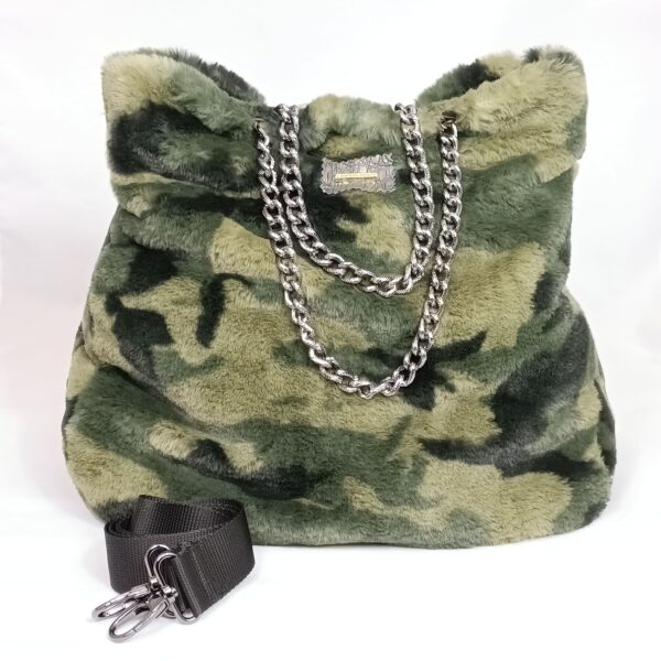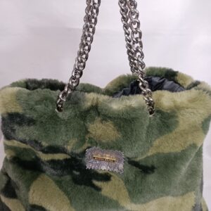 Borsa di pelliccia ecologica fantasia camouflage , manici di catena color canna di fucile , interno foderato con tasca a zip, disponibile con tracolla su richiesta .
