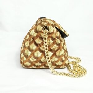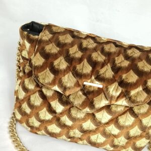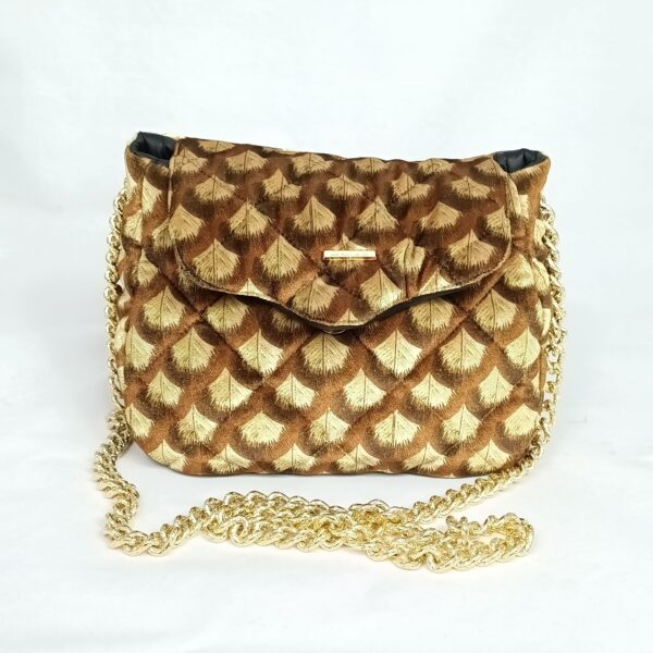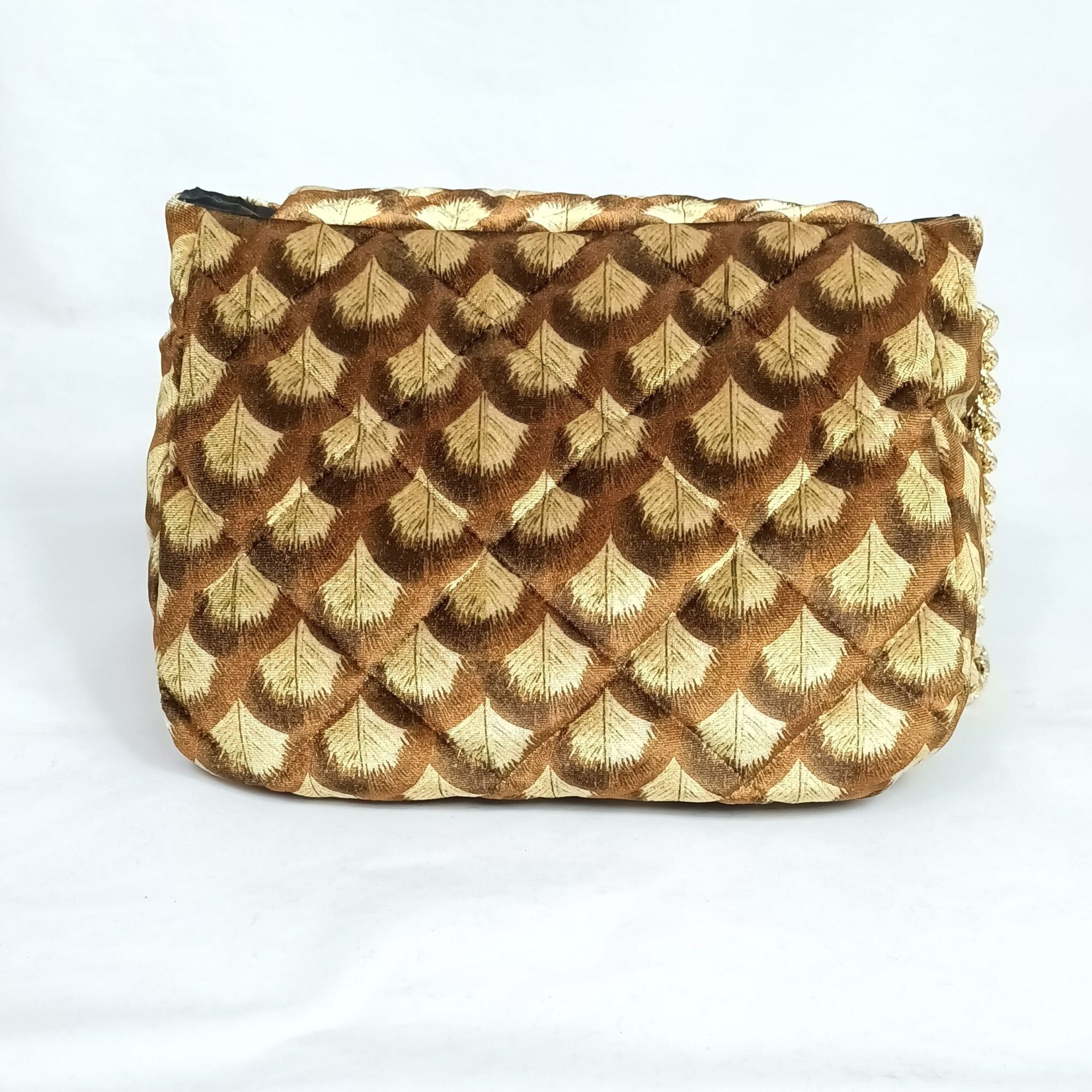 Borsa di velluto liscio trapuntato fantasia piumetta , interno foderato con tasca a zip, tracolla a catena dorata , chiusura a calamita .