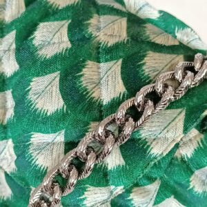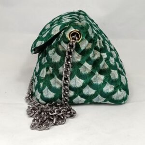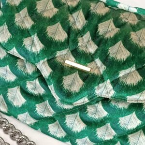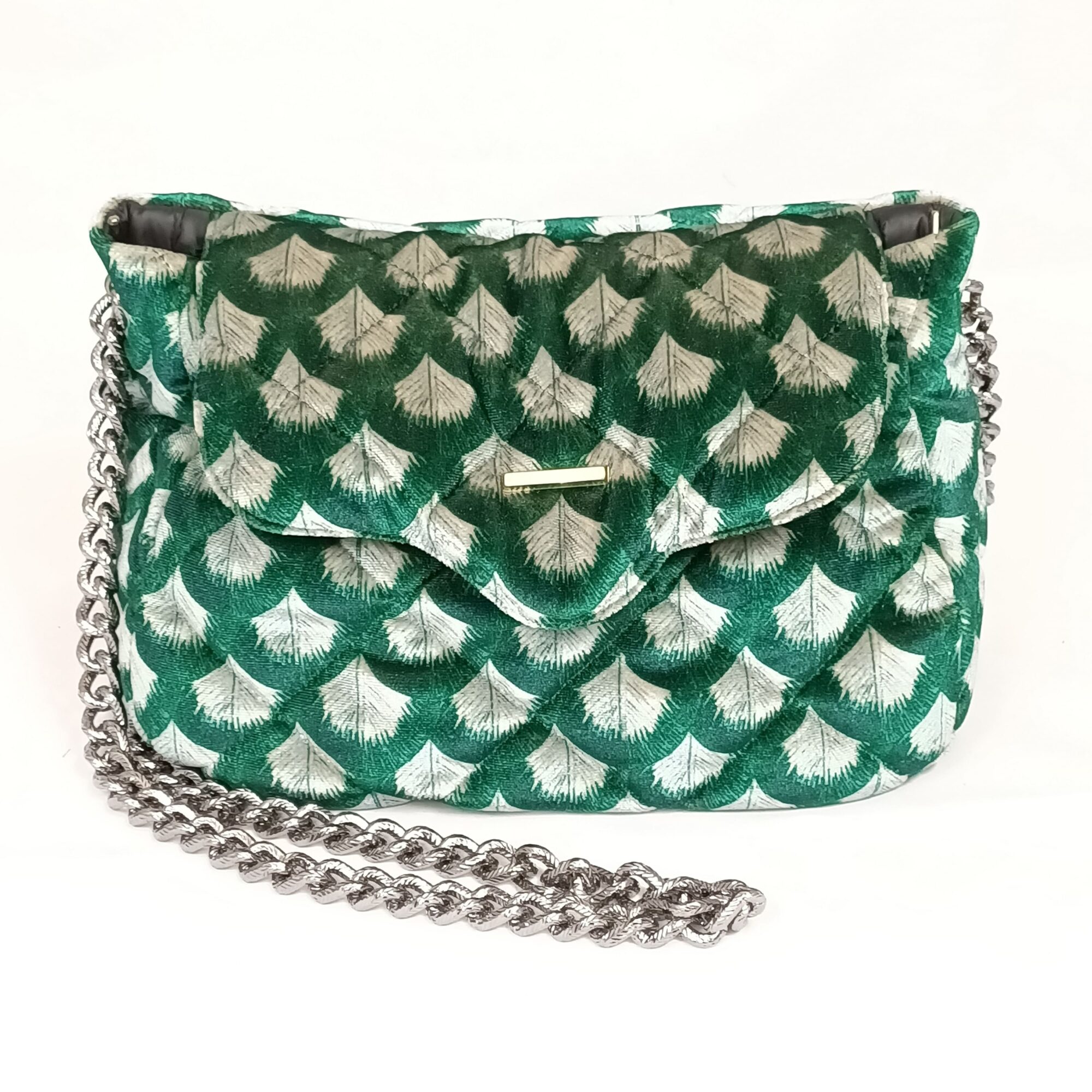 Borsa di velluto liscio trapuntato fantasia piumetta , interno foderato con tasca a zip, tracolla a catena dorata , chiusura a calamita .