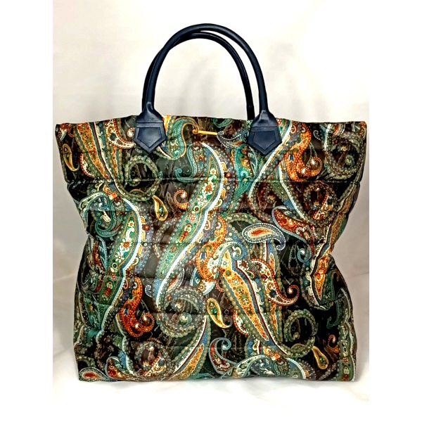 Shopping Bag in tessuto tecnico fantasia cashmere , manici di pelle , interno nero con grande tasca di tessuto fantasia cashmere con chiusura a zip .