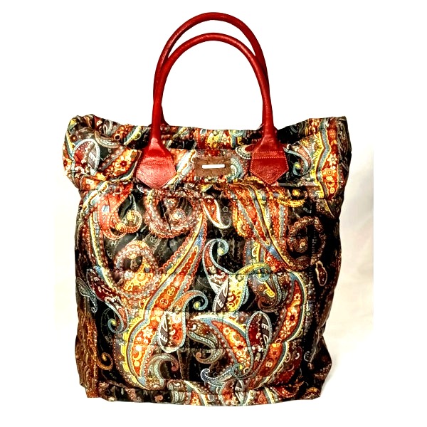 Shopping Bag in tessuto tecnico fantasia cashmere , manici di pelle , interno nero con grande tasca di tessuto fantasia cashmere con chiusura a zip .