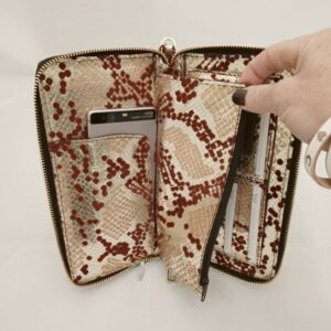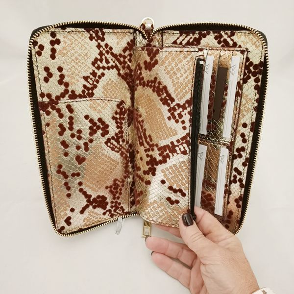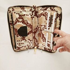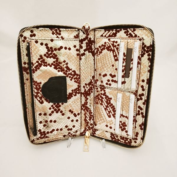 Pochette originale in pelle stampata pitone colore oro /oro rosa con floccage rosso , con tre funzionalità …ovvero ,borsa serale con interno portafogli e porta carte di credito , porta monete , e porta cellulare sia esterno che interno . piccolo manico per polso , chiusura a zip color oro . Questo splendido modello può essere realizzato su richiesta anche con altra tipologia di pellame , anche pregiato . Per qualsiasi info contattateci .