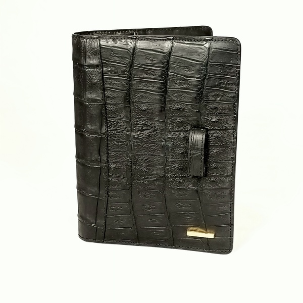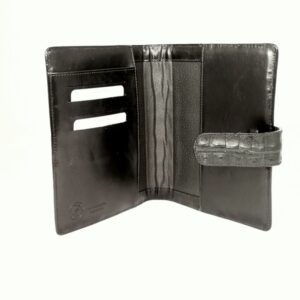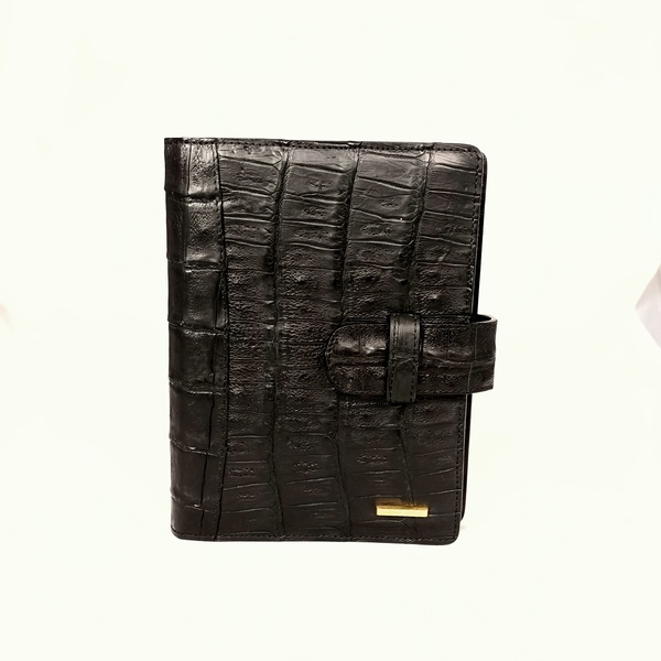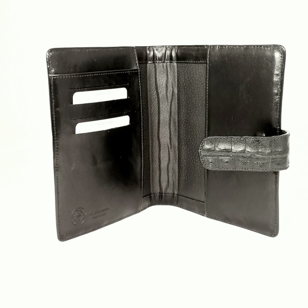 Porta agenda di coccodrillo con motivo mezza luna nello snodo ,colore nero opaco, chiusura a fascia con passante internamente porta documenti e carte di credito.