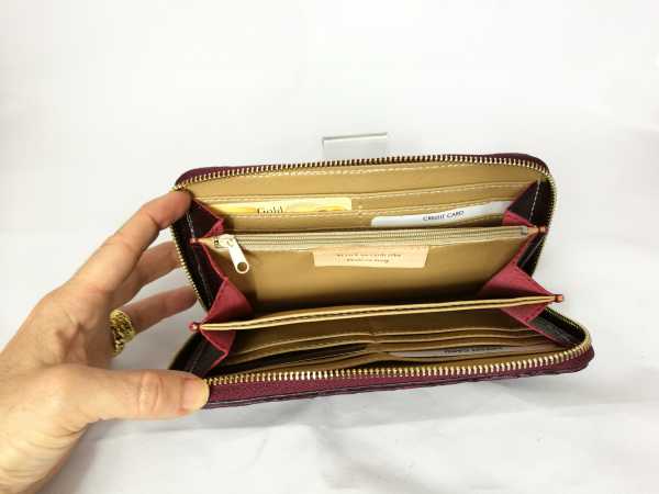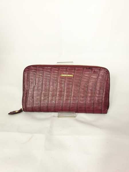 Portafogli da donna di caimano color Borgogna, chiusura a zip. Interno con 2 scomparti, porta carte di credito e porta monete.