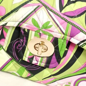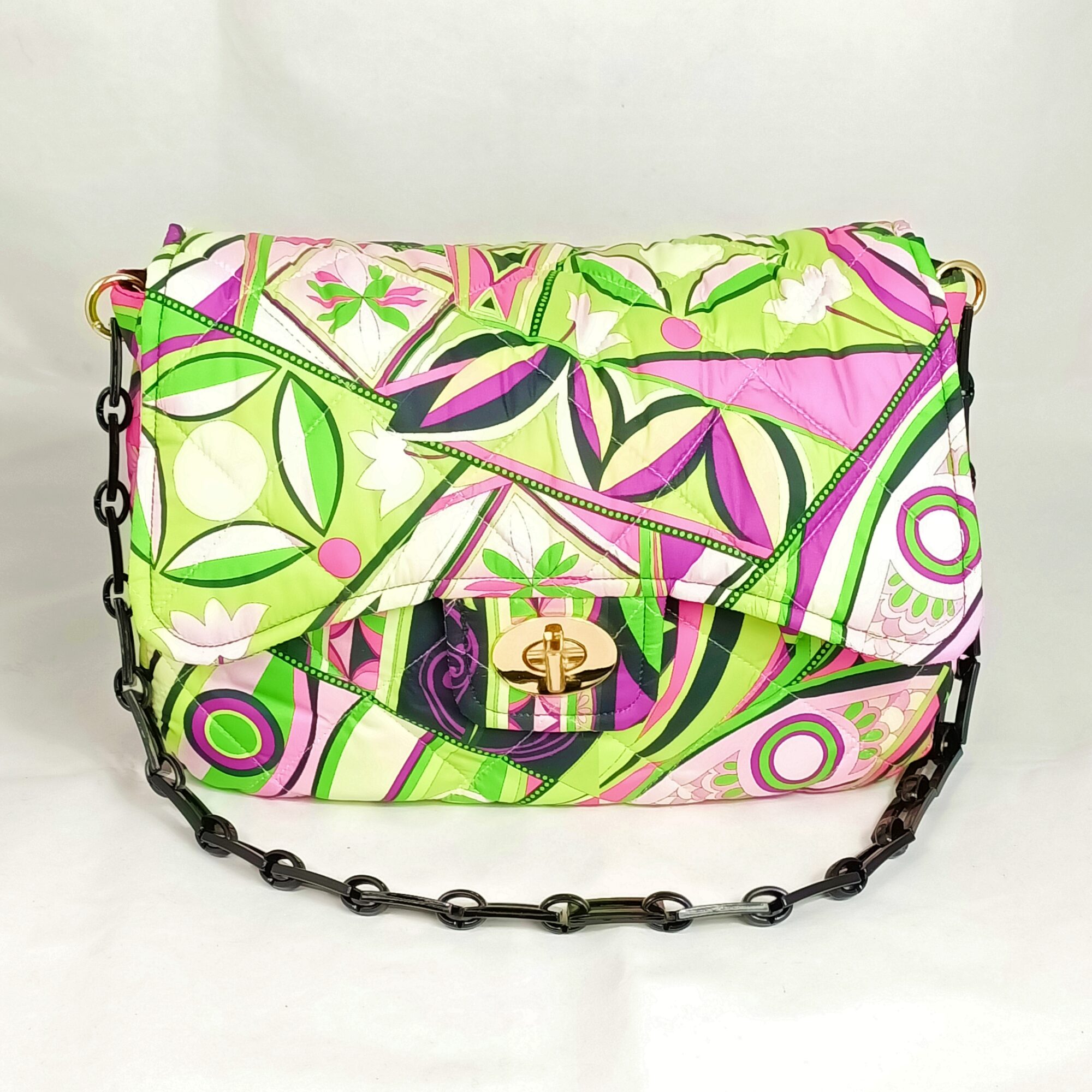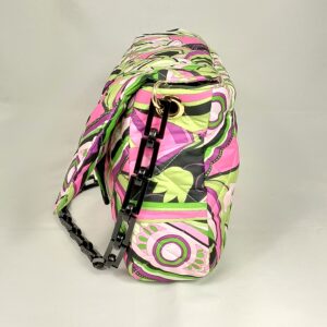 Borsa realizzata a mano con tessuto termico dal disegno futurista con colori verde/fucsia/nero, molto leggera , 200 gr. circa .Interno nero con tasca a zip , bella chiusura a girello in oro, e tracolla in resina . Su richiesta la catena può essere sostituita con altro tipo di tracolla ( catena oro oppure in tessuto). Tutti i nostri articoli sono pezzi unici , il nostro Brand vende solo presso la sede a Torino . Per qualsiasi richiesta contattateci .