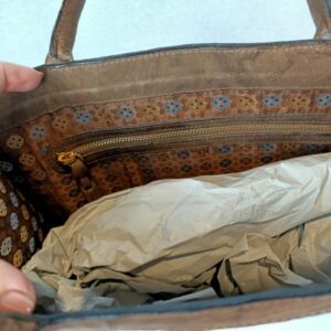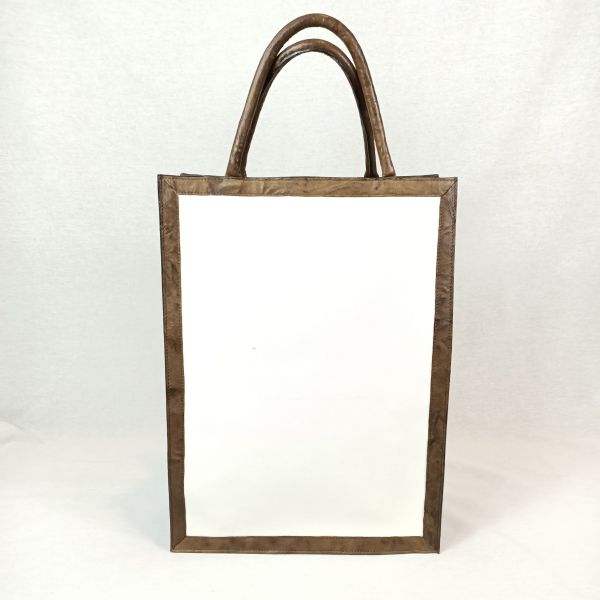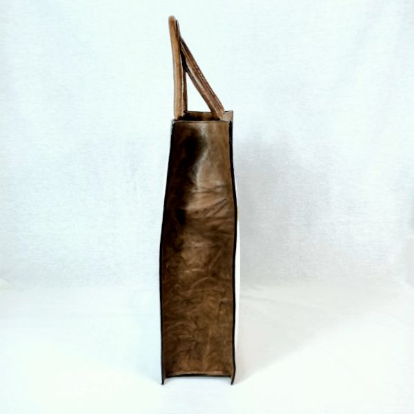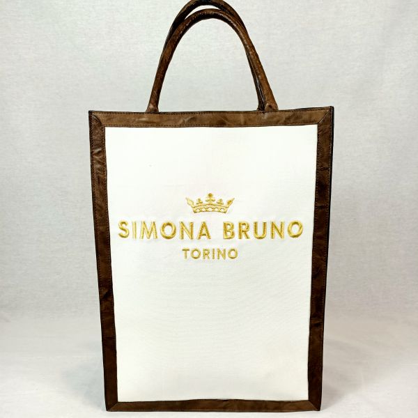 Borsa shopper dalla linea essenziale in pelle di vitello effetto vintage e tessuto sul davanti e sul retro . Ricamo in oro del nostro Brand . Interamente foderata di seta , tasca interna.